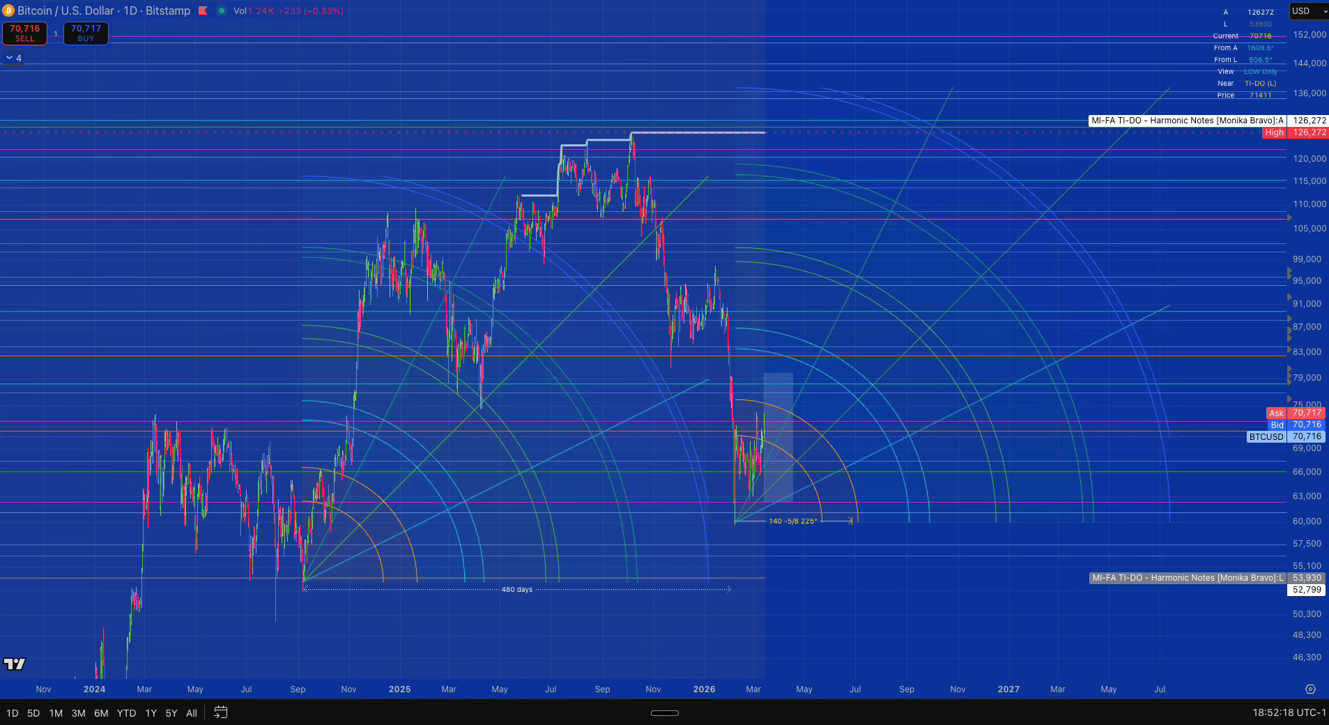 From the 59,930k low, price has climbed to 73,100k in 26 days. On March 13 it reached the Ichimoku cloud ceiling at 75,526. The cloud’s top sits at the same level as a Gann harmonic calculated from the ATH. Two independent systems point to the same resistance.