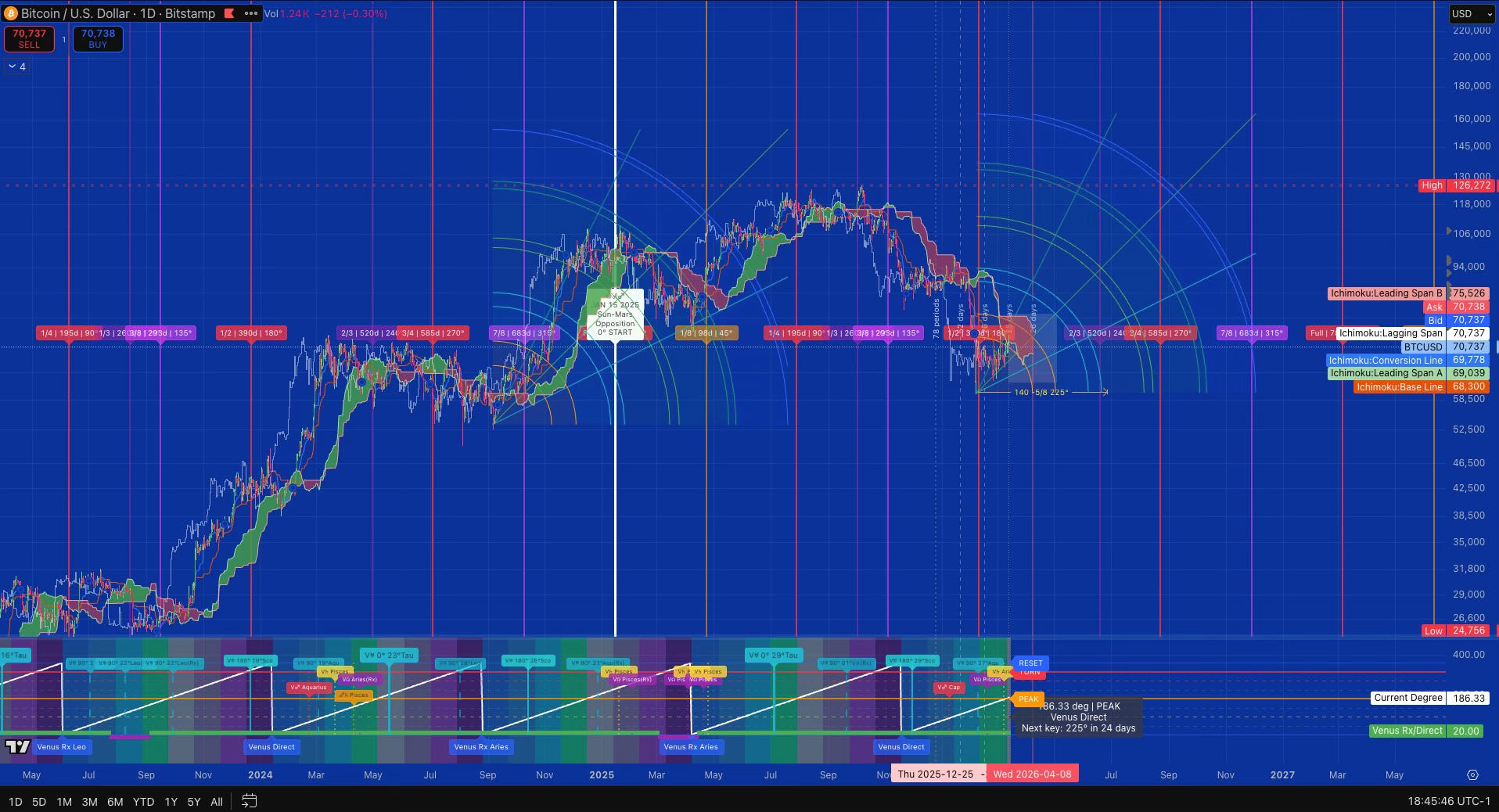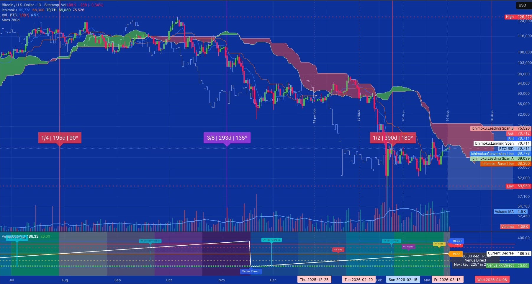 If price clears 75,526k before April 6, the move continues upward. Next targets are 82,796k and 84,554k. The Chikou holds above the Kijun. Venus 225° could signal yet another cycle.
