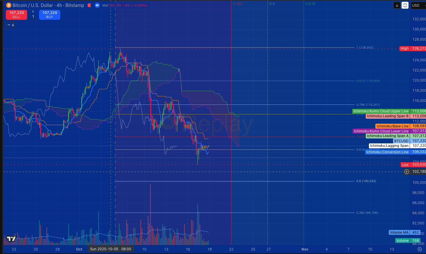 Volume stayed weak — around 80 % compared to 250 % during the capitulation — and the Chikou Span (the memory of the market, plotted 26 periods behind) still hasn’t confirmed.