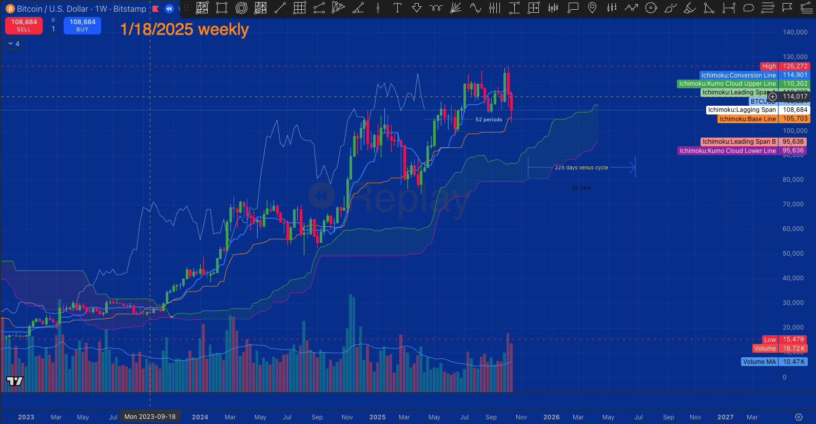 Weekly: 107.2 k below cloud; Tenkan 114.9 k; Kijun 113 k; thick cloud still below price.