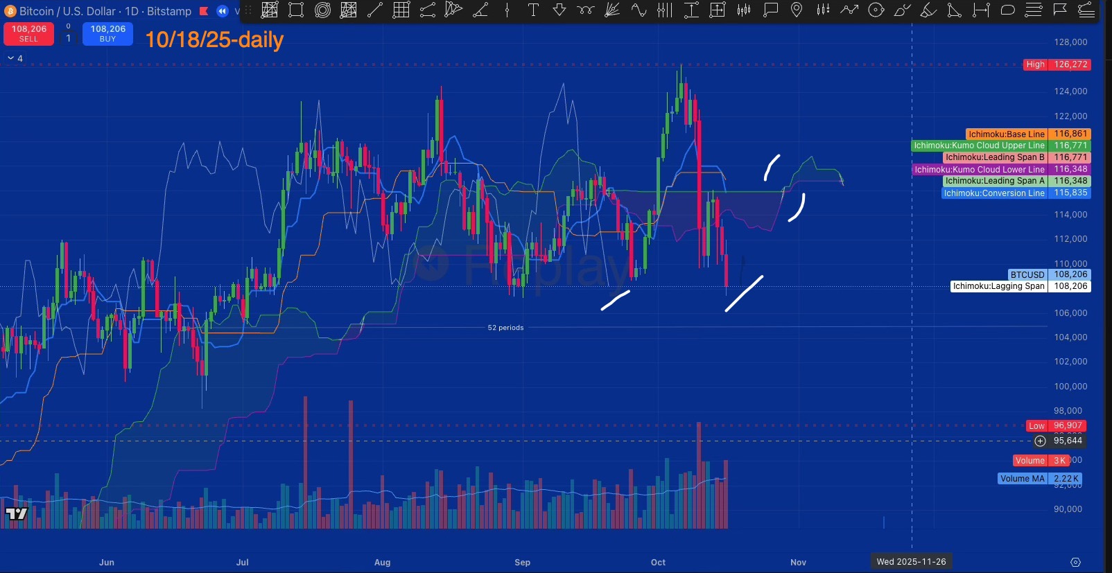 The breakout completed the setup I had been tracking since the 17th: the 108 k–110 k cloud test and the daily twist scheduled for October 28.
