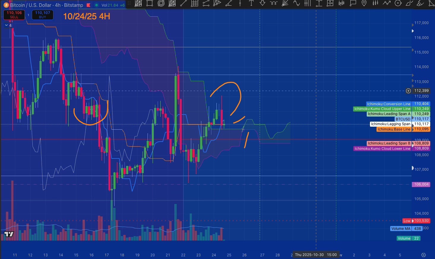 4 H: Price broke above cloud at 110 k on low volume; Chikou above Kijun but still below cloud.