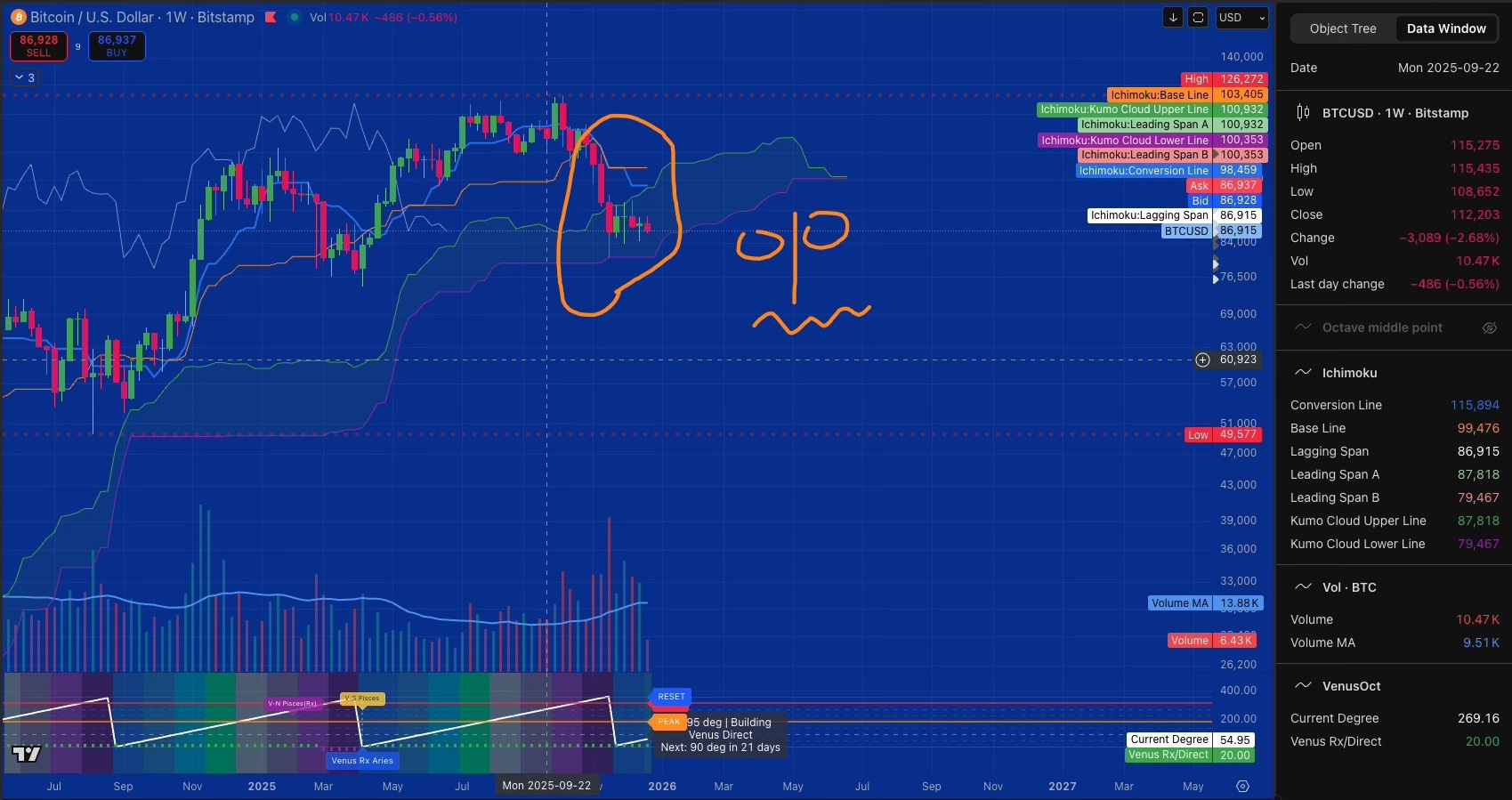 When I say my charts show “bearish structure,” I’m describing what the indicators are telling me right now - not declaring a confirmed bear market. The Chikou Span crossing below the Kijun would be one confirmation signal, but proper bear market confirmation requires multiple timeframe validation and sustained price action below key support levels ($80k - $85K).
