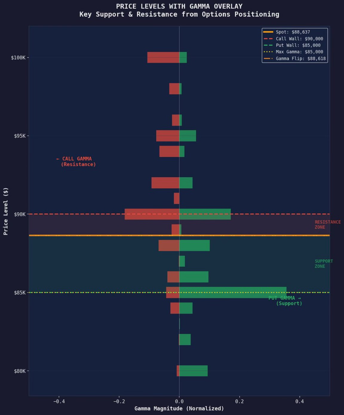 Right now, Bitcoin has enormous gamma concentration between $85,000 and $90,000. Dealers are extremely sensitive to price moves in this range. They have to trade constantly to stay neutral.