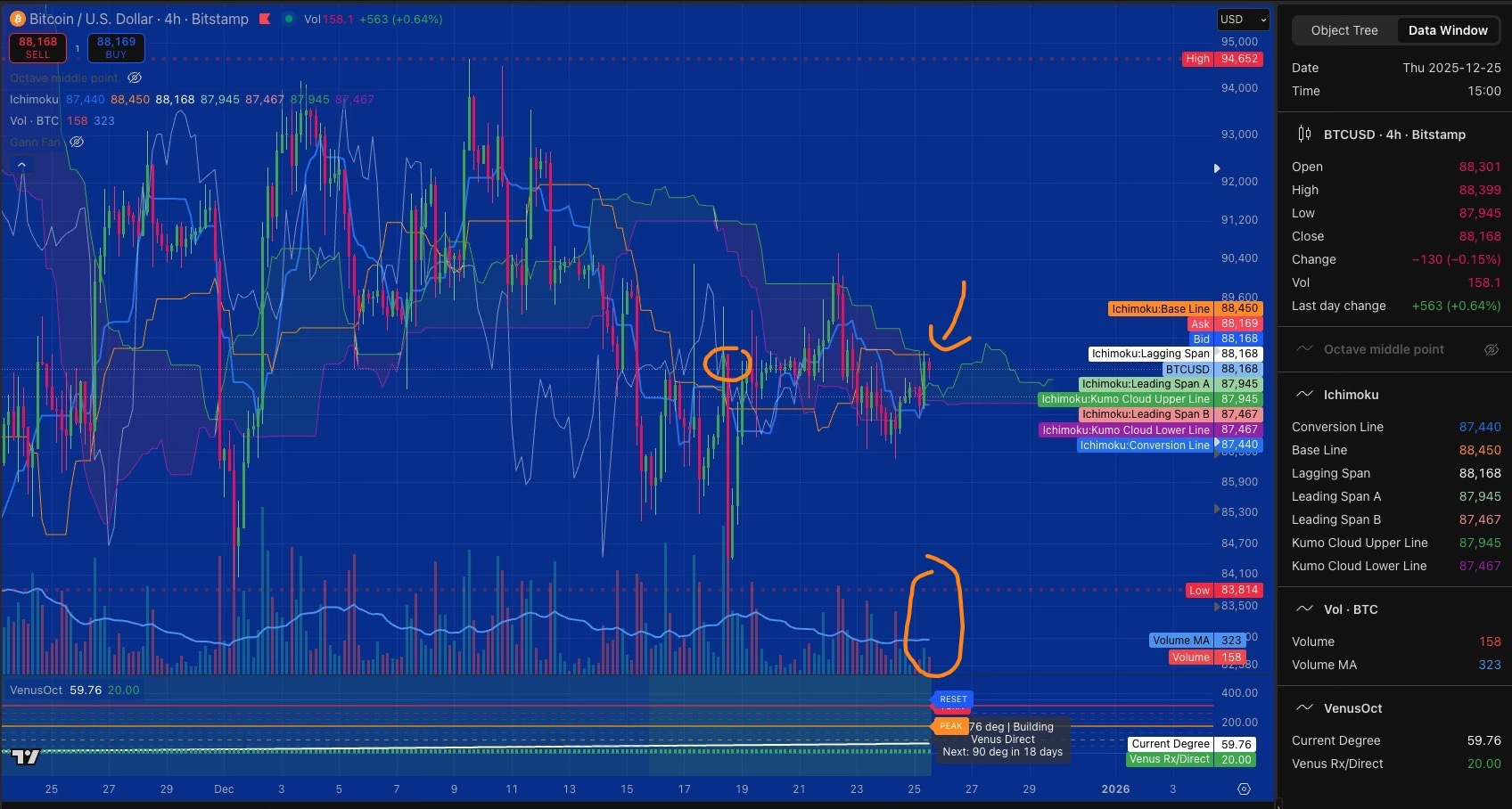 Looking at my daily Ichimoku chart, my cloud bottom (Leading Span A) sits at $88,350. My 4-hour Kijun (base line) is at $88,450.