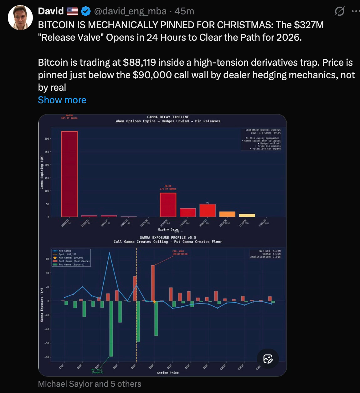 The gamma positioning chart below visualizes what I'd been feeling in my Ichimoku analysis for weeks - price trapped between structural walls. The massive December 26 spike shows more than half the market's gamma concentration expiring in one day. When that bar disappears, so do the mechanical constraints. "While studying why my Ichimoku charts weren't resolving despite clear bearish structure, I came across this analysis from @david_eng_mba explaining the derivatives mechanics behind the $85-90K range. This helped me understand WHY the structure existed, not just THAT it existed."