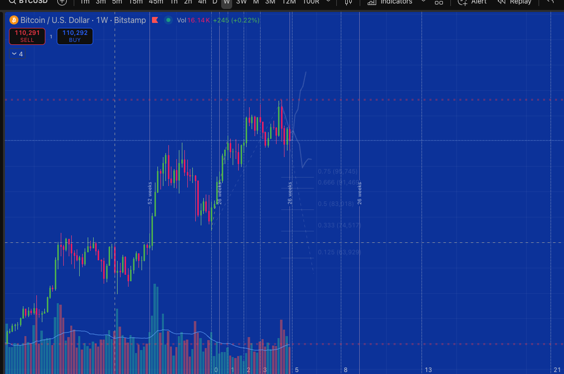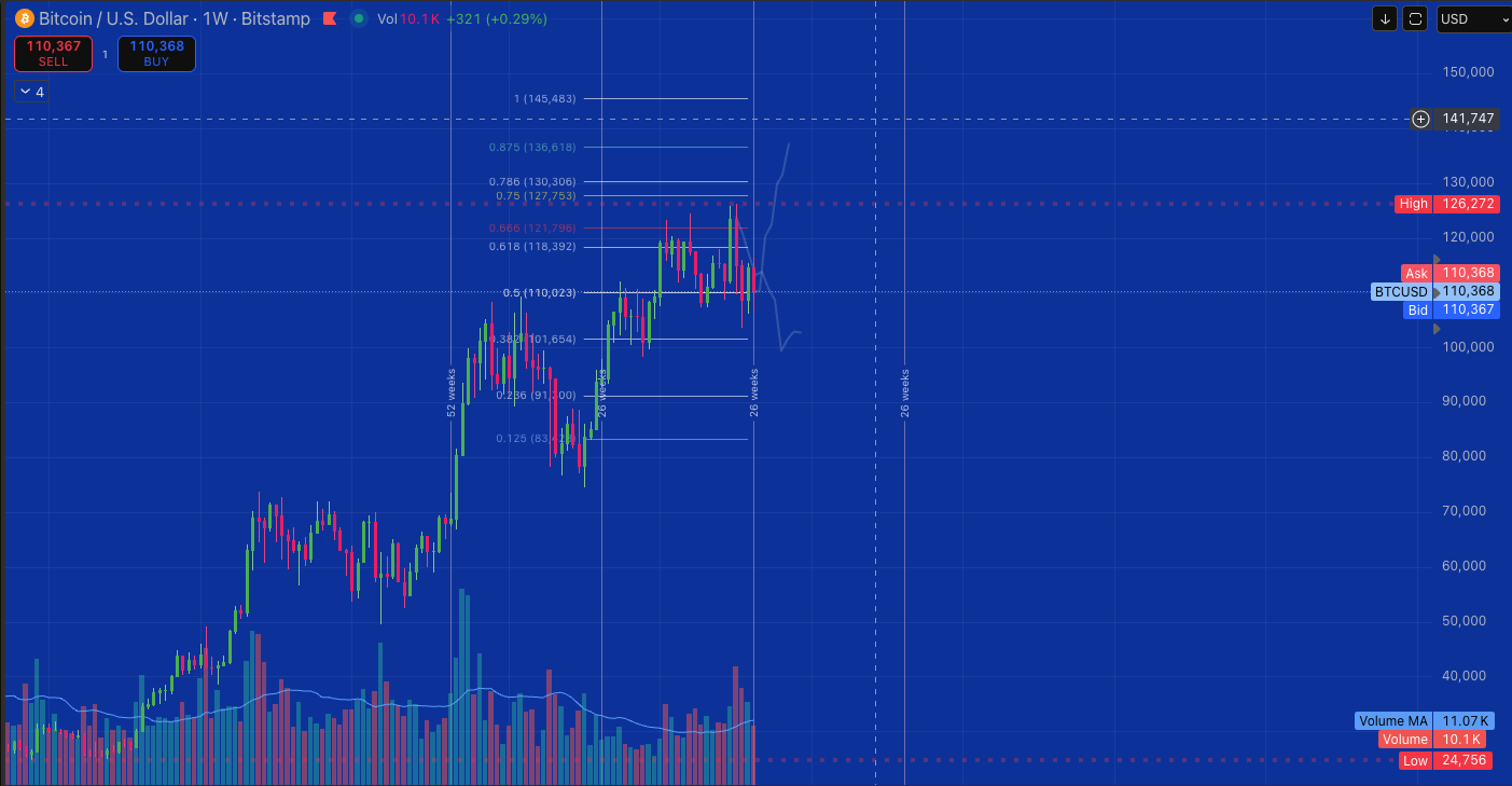 If price breaks 110k but holds 107-108k (52-week midpoint) = shallow correction, still bullish