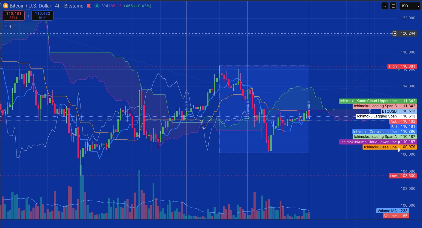 4H: Chikou needs to be clear above 110k, cross Kijun in one day (6 periods), rise above 113.9k in 3 days or less