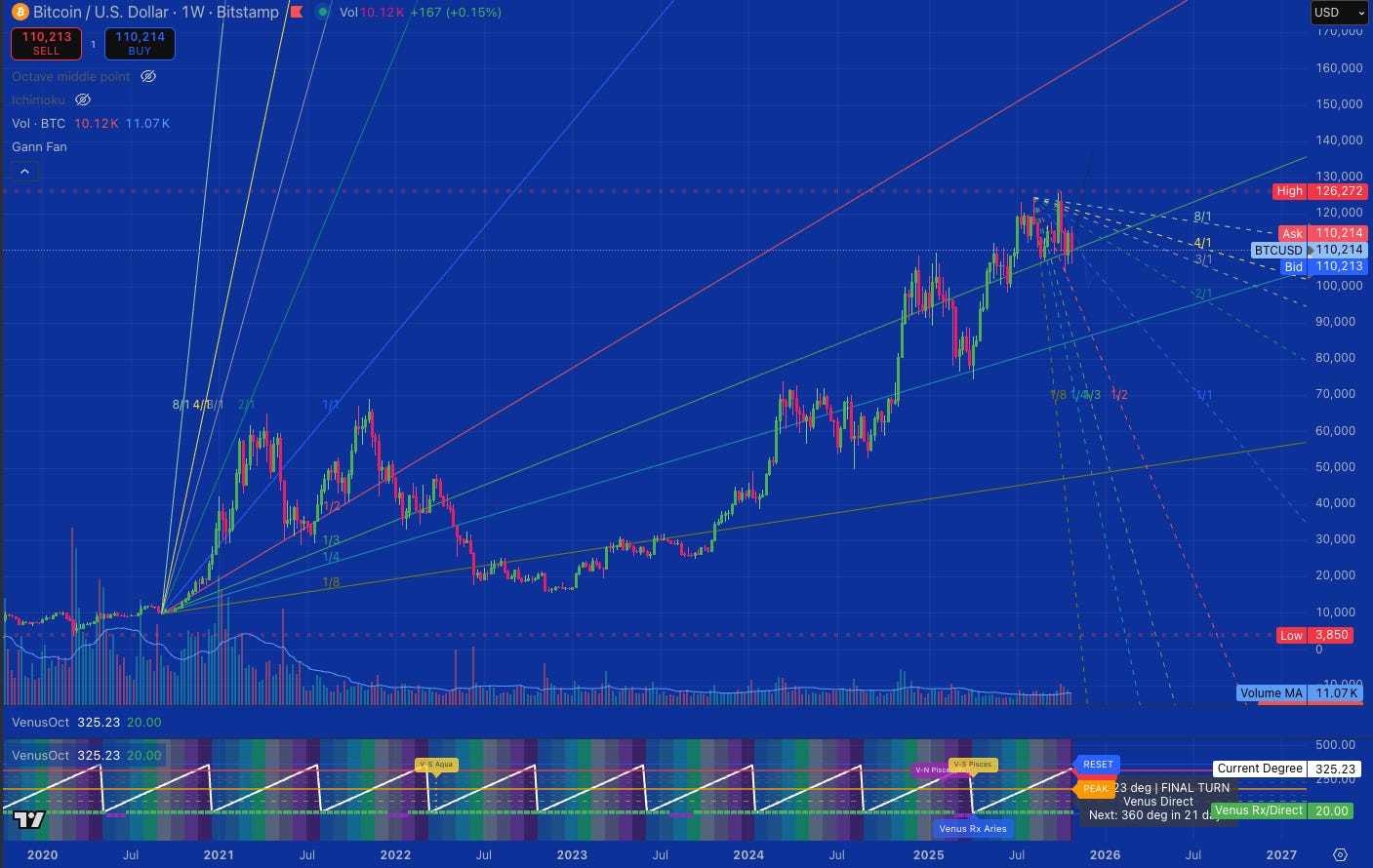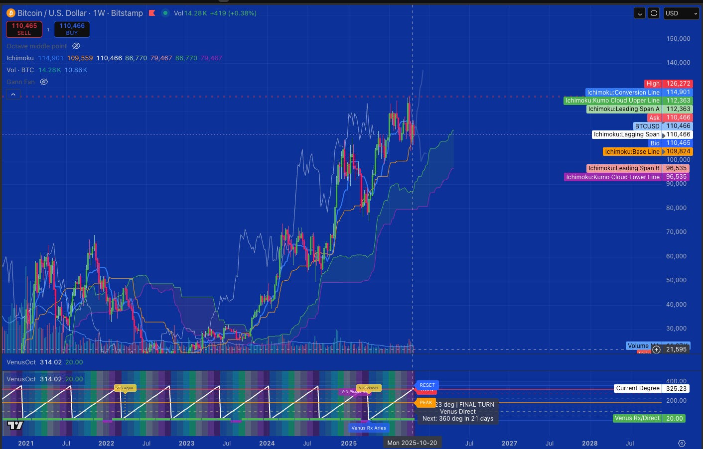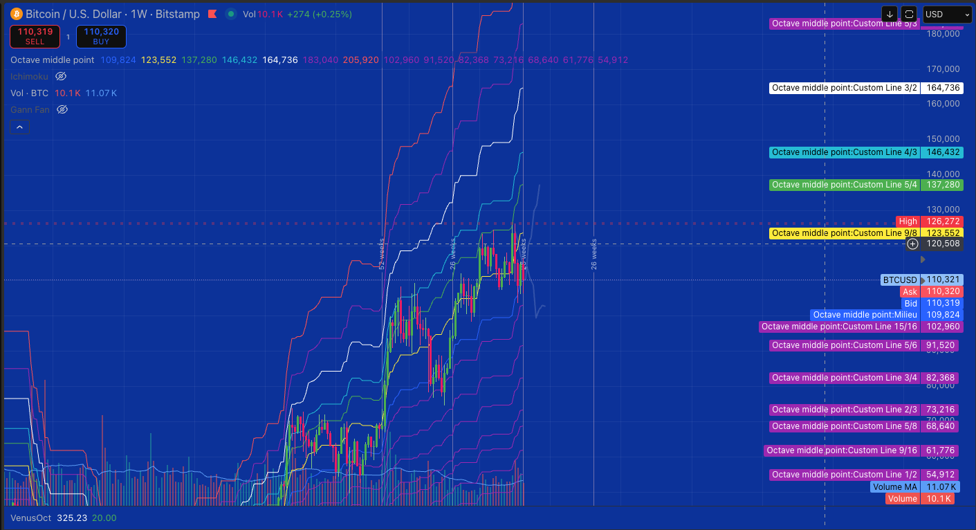 This method revealed that Bitcoin’s current consolidation at 110k is anything but random; it’s testing the weekly cloud top that represents 52 weeks of price memory, with strong support at 96.5k (the equilibrium point of the entire range from 94k to 121k).