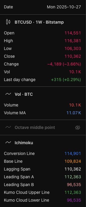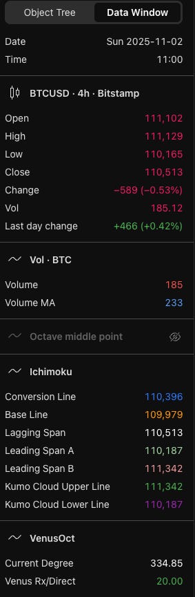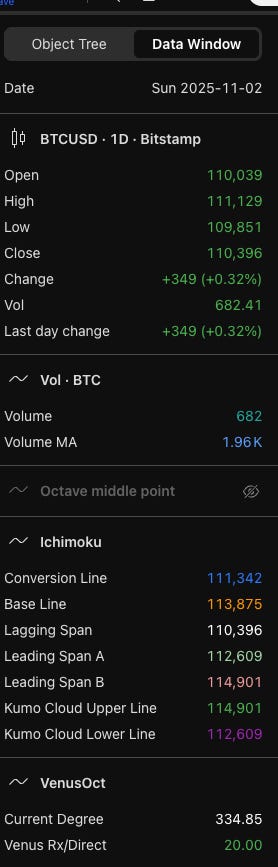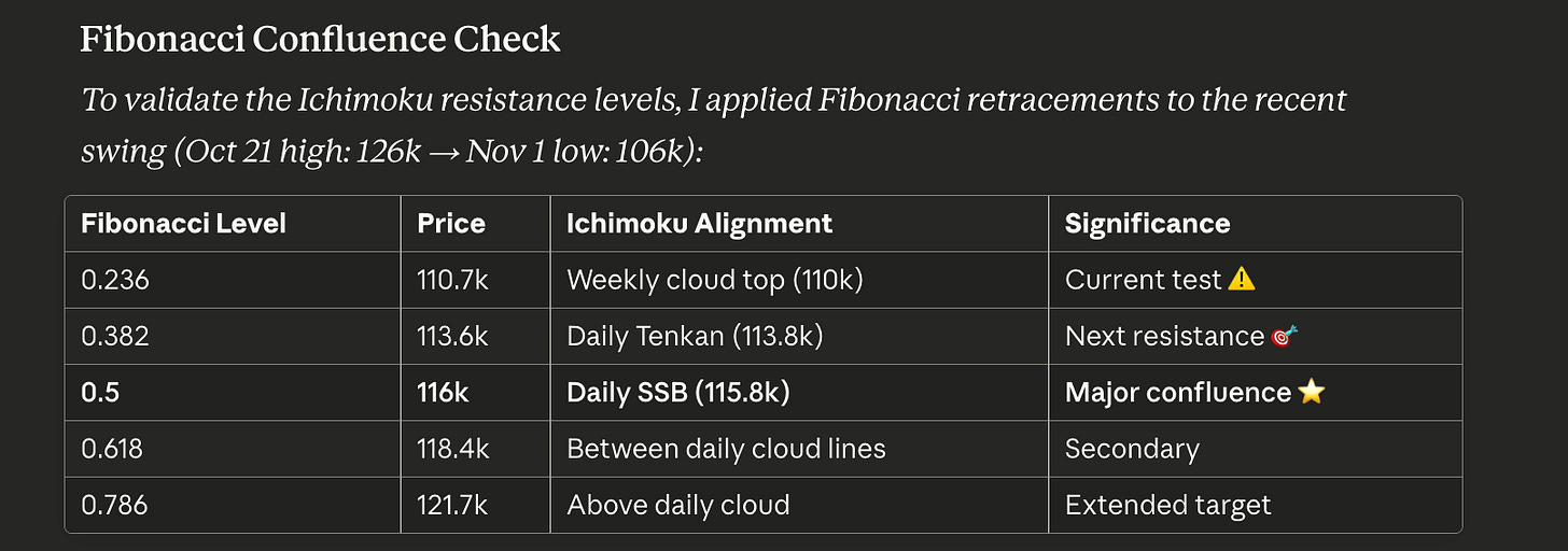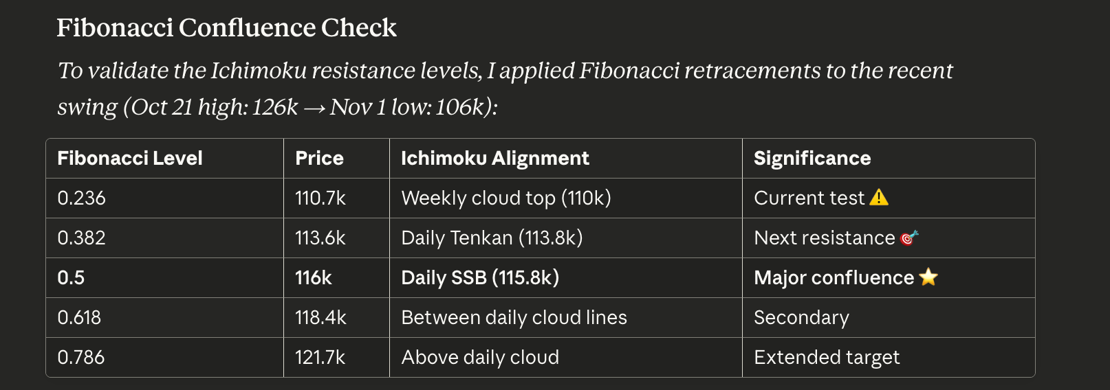 To validate my Ichimoku levels, I drew Fibonacci retracements from the Oct 21 high (126k) to Nov 1 low (106k). The 0.5 Fib level at 116k aligns almost perfectly with the daily SSB at 115.8k—a major confluence zone. This isn’t coincidence: Péloille notes that “the Kijun corresponds to a 50% Fibonacci retracement” by design. When both geometric (Fib) and equilibrium (Ichimoku) systems point to the same level, conviction increases. The 115-116k zone is where I expect strongest resistance if the current bounce sustains.