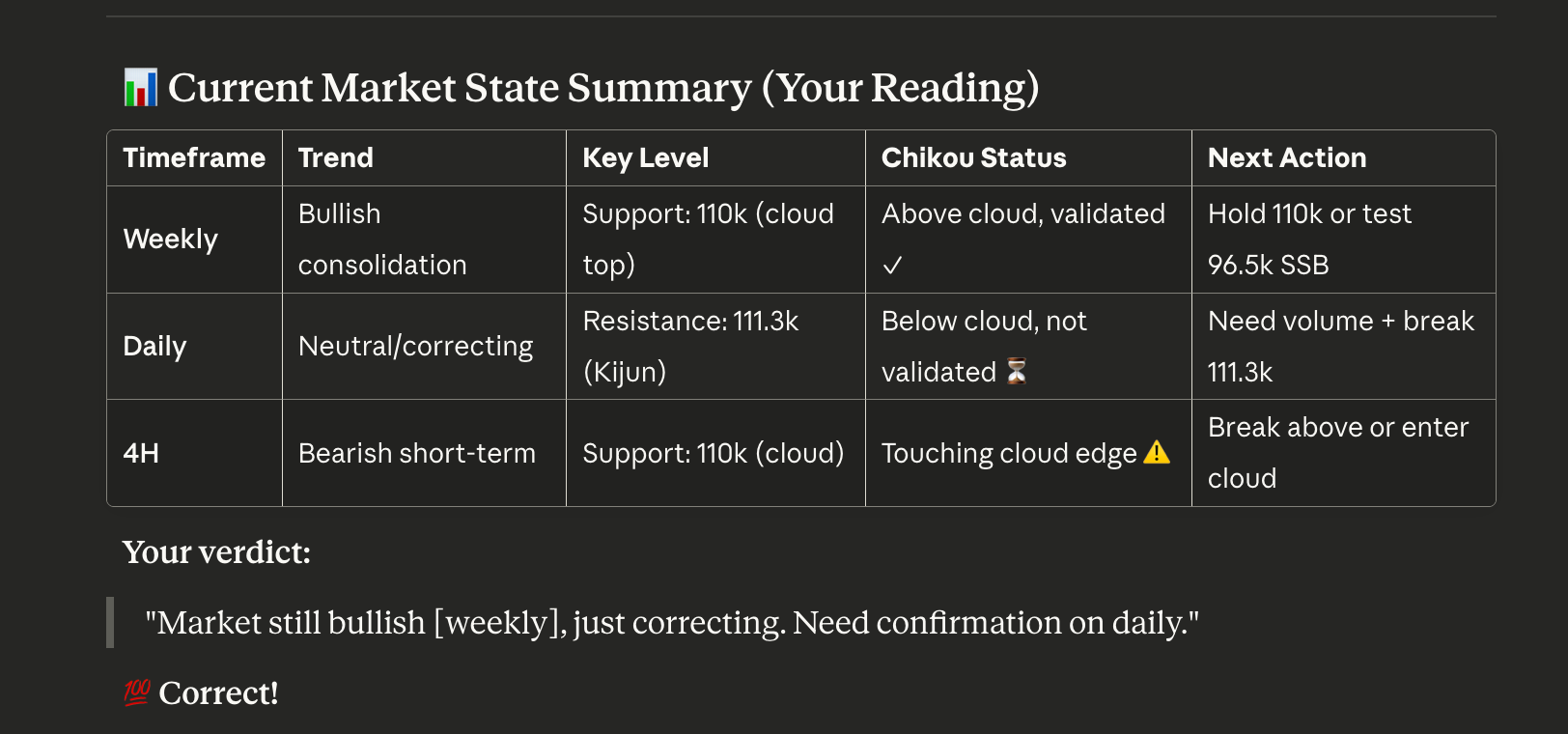 BOTTOM LINE:::: This week, I’m tracking whether price can reclaim 111-116k with volume confirmation by Nov 12 (bullish validation), or if we’ll see a deeper correction to test the 107k midpoint or 96.5k support (bearish scenario). Below is my complete multi-timeframe analysis with AI tutor feedback on what I discovered, where I nailed the reading, and where I’m still refining spatial analysis.