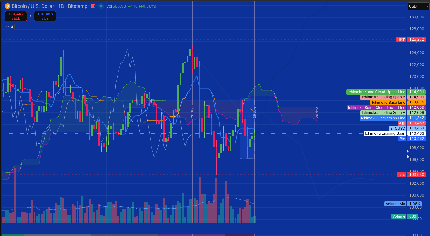 “52 periods: Chikou 113.5k, Kijun and Tenkan at 110k above cloud, SSB 109.7k” “26 periods: Chikou touching SSA 110.2k, if it enters in next hours, price can go sideways as Chikou will encounter obstacles”
