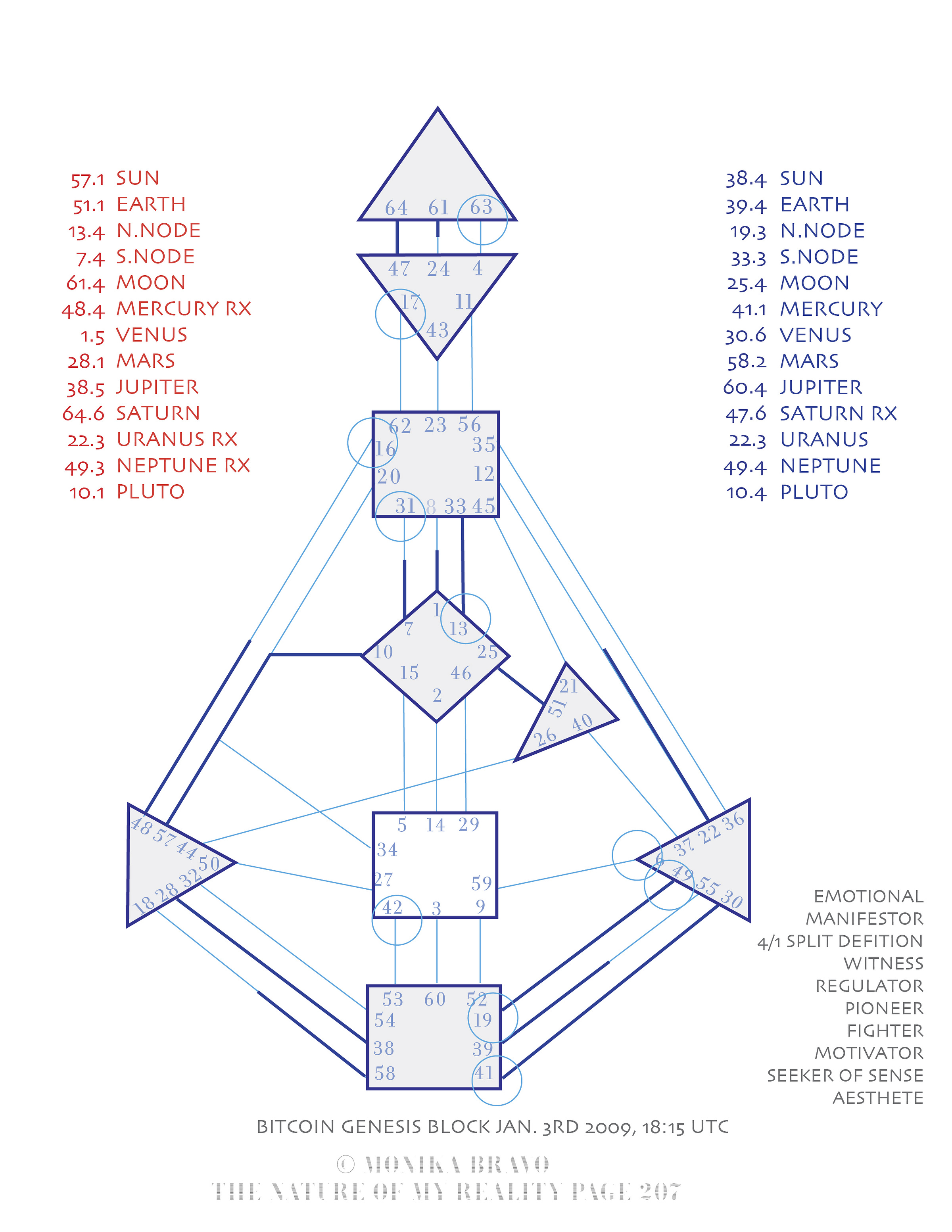 Neptune in Gate 49.4 (Revolution) signifies the dismantling of outdated structures and the rise of transformative solutions aligned with higher principles. This placement underscores Bitcoin’s role in ending reliance on fiat systems and establishing financial sovereignty. These gates and lines embody Bitcoin’s revolutionary essence, transforming turmoil into wisdom and laying a foundation for fairness, transparency, and individual empowerment. Bitcoin1 thrives on the chaos it seeks to resolve, inviting a new paradigm of decentralized freedom.