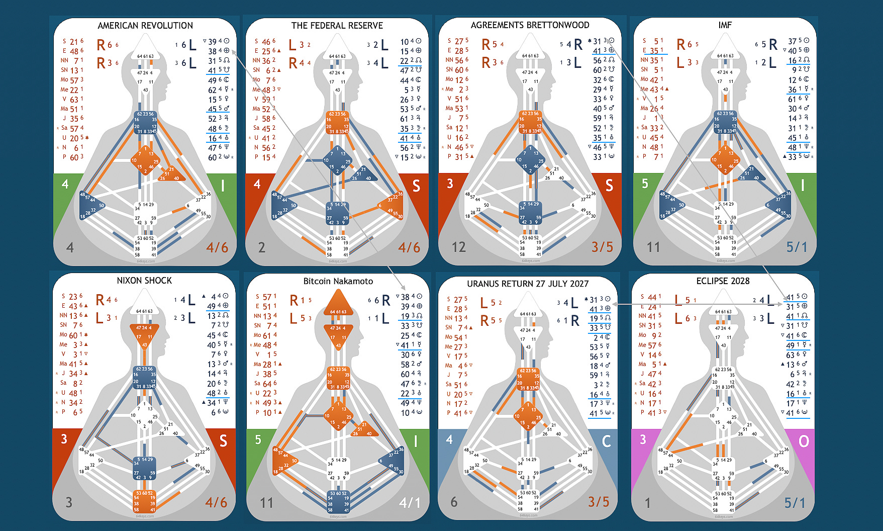 I interpret the energies of “portals” to decipher key historical and future events: the American Revolution (1776), the Federal Reserve (1913), the Bretton Woods Agreement (1944), Nixon's Shock (1971), Bitcoin's Genesis Block (2009), Uranus' return to the USA Constitution chart (2027), and the Annular Solar Eclipse (2028).