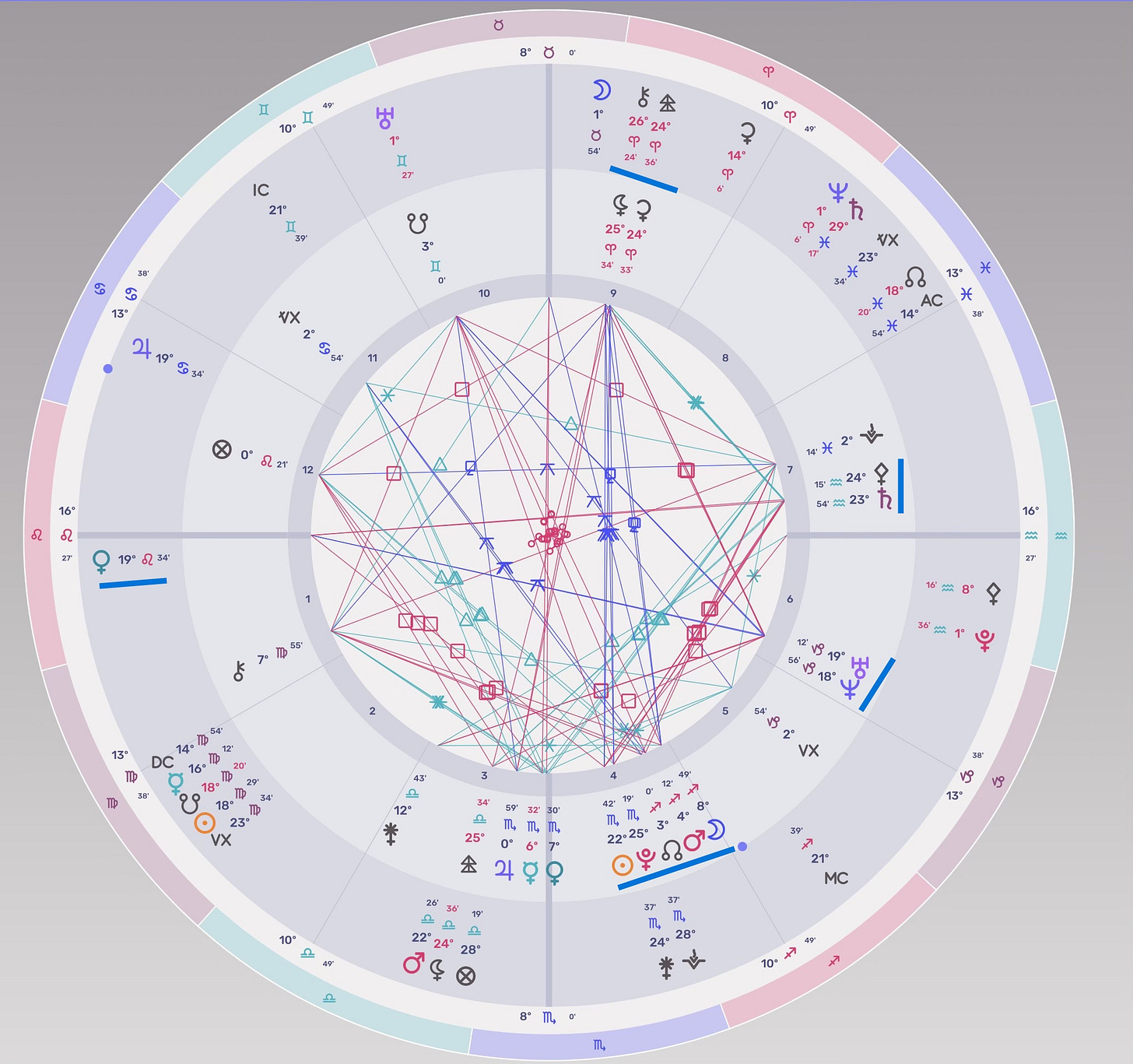 I turned to his progressed chart on the day of his death. A progressed chart is different from the natal chart because it measures the unfolding of the soul through this lifetime. What I saw was striking. Venus was transiting his first house, right on the progressed Ascendant. It opposed Saturn and it squared the progressed Sun and Pluto conjunction in Scorpio at the root of his chart. This is the wound to the throat, the silencing of speech, the sudden interruption of creative expression. The Sun and Pluto with the North Node reveal a karmic culmination, the soul reaching its evolutionary threshold.