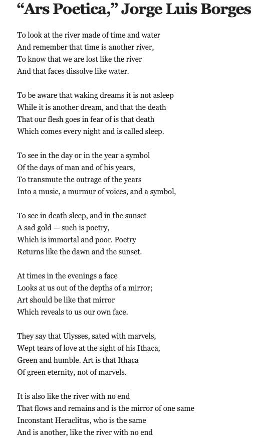 Connecting back to Borges and Ars Poetica that I used in one of my artwork site-interventions back in the year 2000 and it’s here below. He writes in it that the river flows, yet it forms, and it is never uniform.