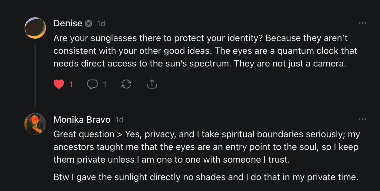 I was thinking, basically my critique is something that I have experienced in my life, in the sense that I was very fortunate to remember past lives, so I did ask my mom to take me to the needle man when I was very young, like 10, 11 years old, and she did find a needle man, somebody who had lived in China, and practiced acupuncture, and also he had studied homeopathy, el Doctor Moya so I was introduced very early on to different and ancient modalities that are still called “alternative” lol, but for me they are not alternative but essential, hence I started having a relationship with my body differently, although I have to admit that a lot of the process in my life has been to recognize the amount of disassociation I’ve had in my body, trying to remember moments in my life that they created an impact, and I tend to forget them, but anyway.