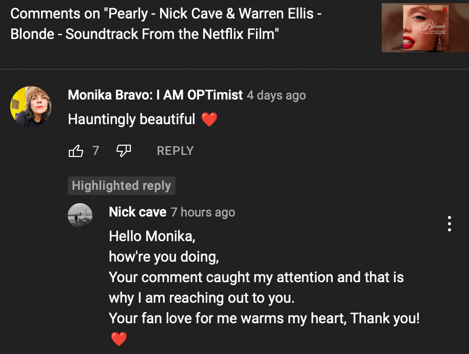 And there it was, a gesture of kindness, a reply to a comment I made on Youtube from all places, from the man himself. Nick Cave the polymath, the songwriter, the singer, the writer, the ceramist, the human, the one that bears his deep pain on his chest and shows strength as vulnerability.