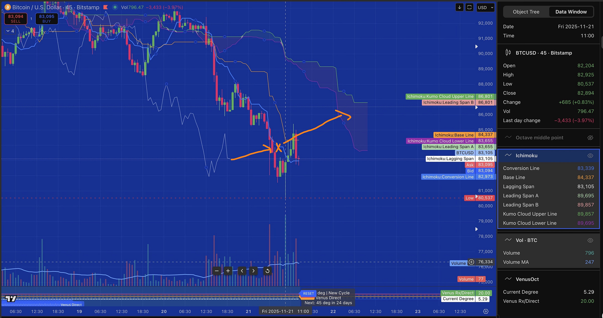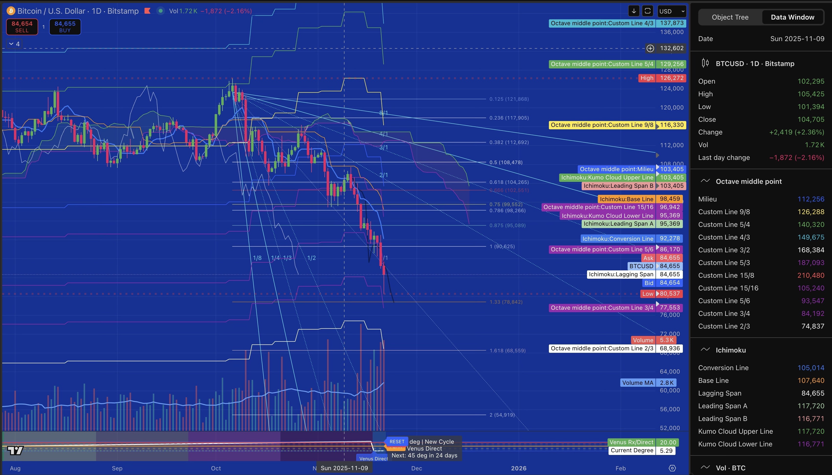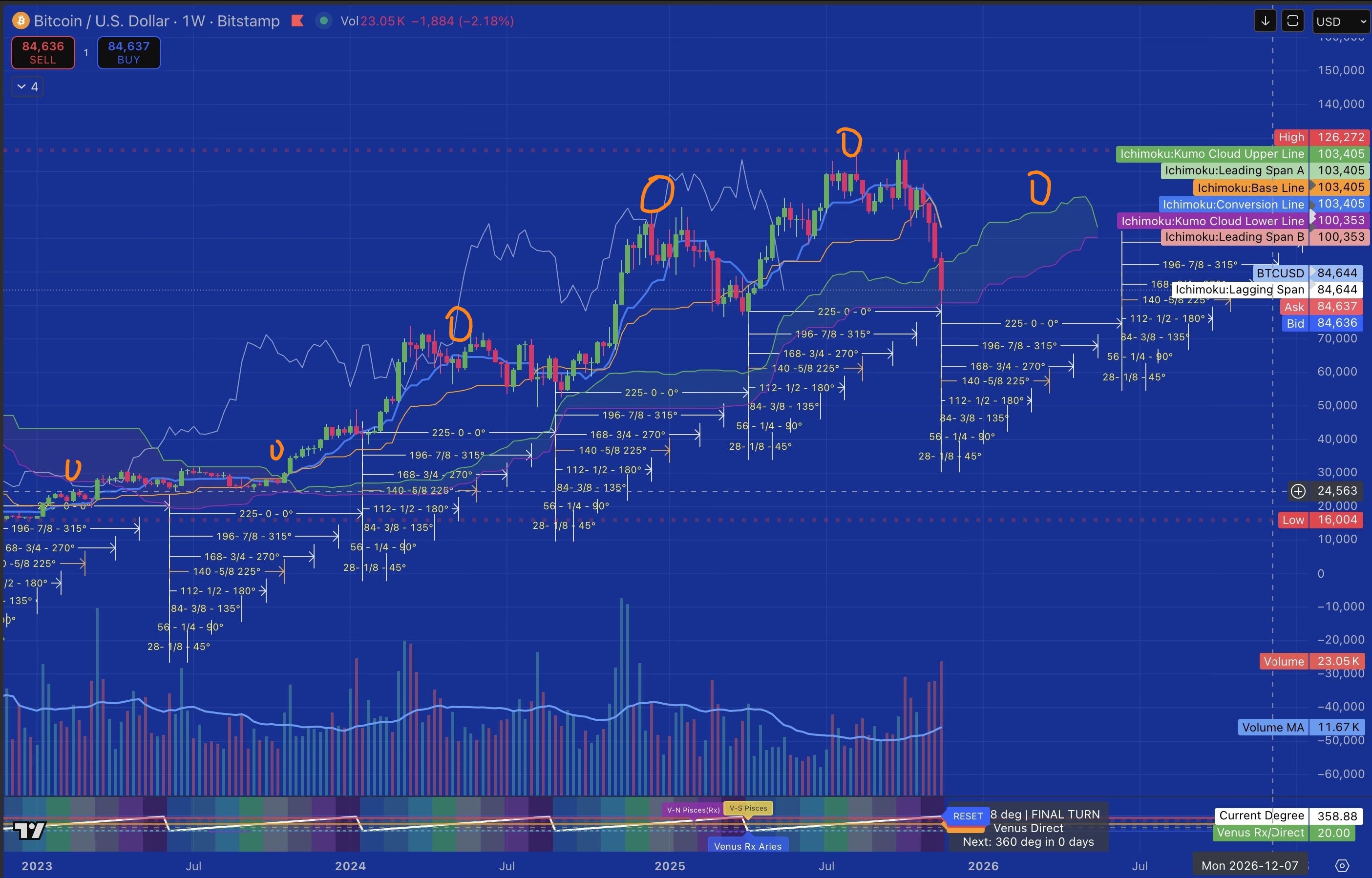 Frameworks: Ichimoku Kinko Hyo (27-period Chikou), Gann Geometry, Venus Cycles (224-day), Fibonacci Extensions, Volume Analysis