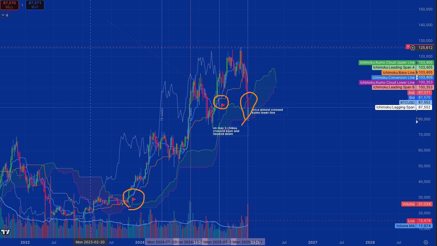 This would delay but not invalidate the weekly breakdown. The May 2025 warning would remain valid until price reclaims the weekly cloud and the Lagging Span reverses its descent.