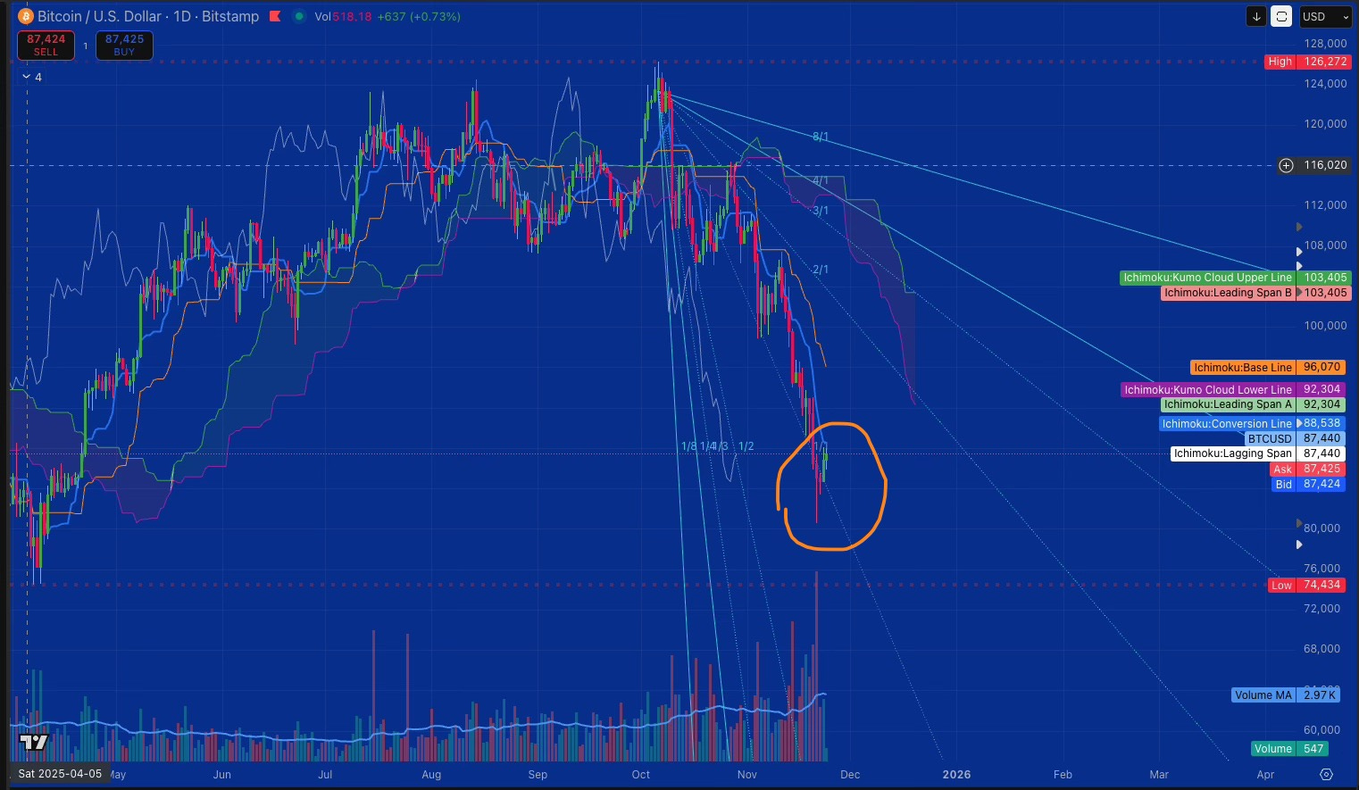 When price broke the weekly cloud this week, something else became visible: the Lagging Span—representing current price at 87k plotted 26 weeks back—now sits far below the weekly Kijun at 103k. This is the market’s memory showing us how far equilibrium has shifted.
