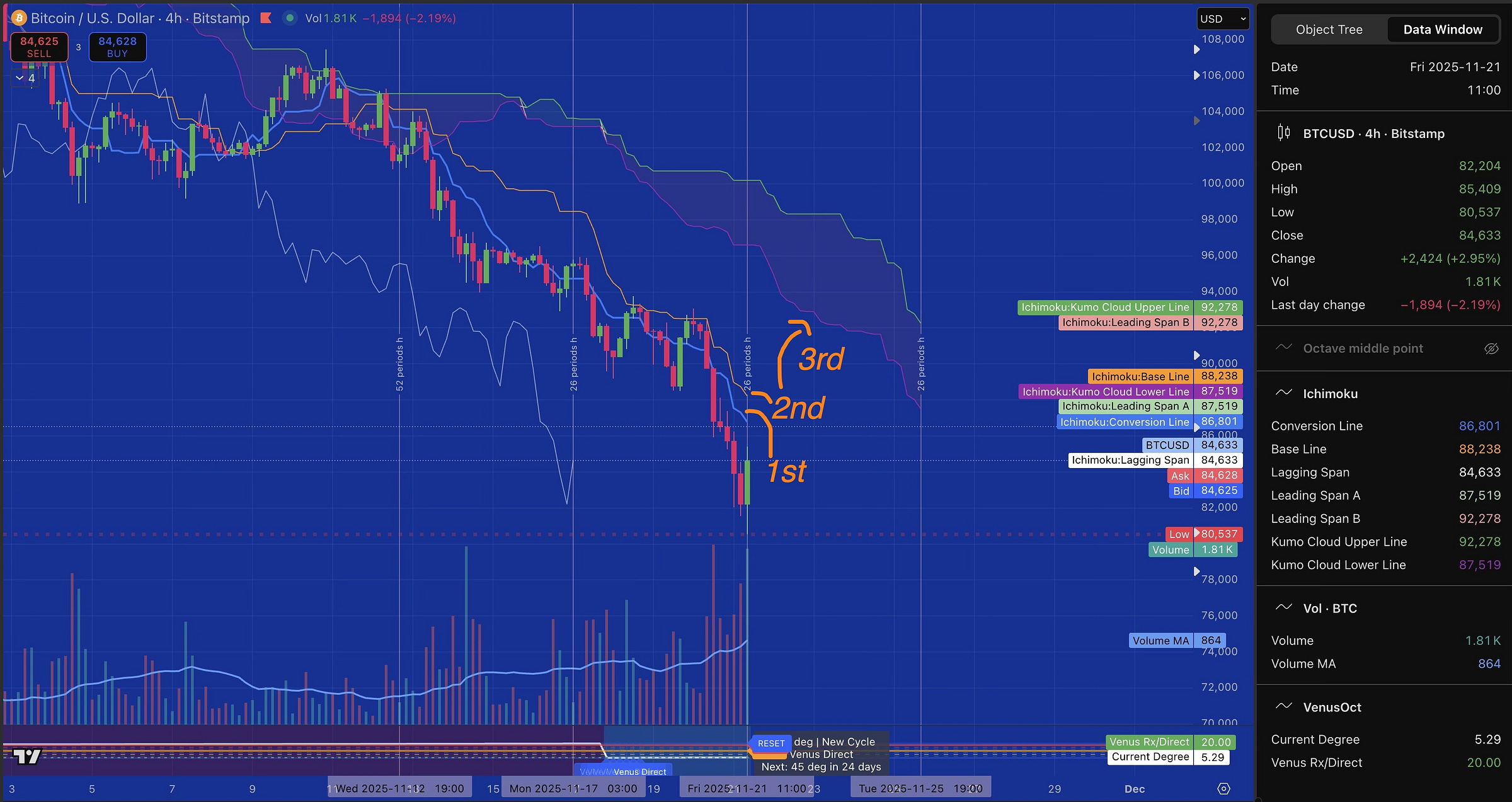 By 11:10am Thursday, price broke Monday’s 88,497 support, hitting 88,366. The 1-hour Chikou broke the Kijun downward with volume expanding to 140% of the moving average—the bearish confirmation. My Secondary Scenario was activating: breaks 88k, tests 85k, possibly accelerates to 80k if support fails.