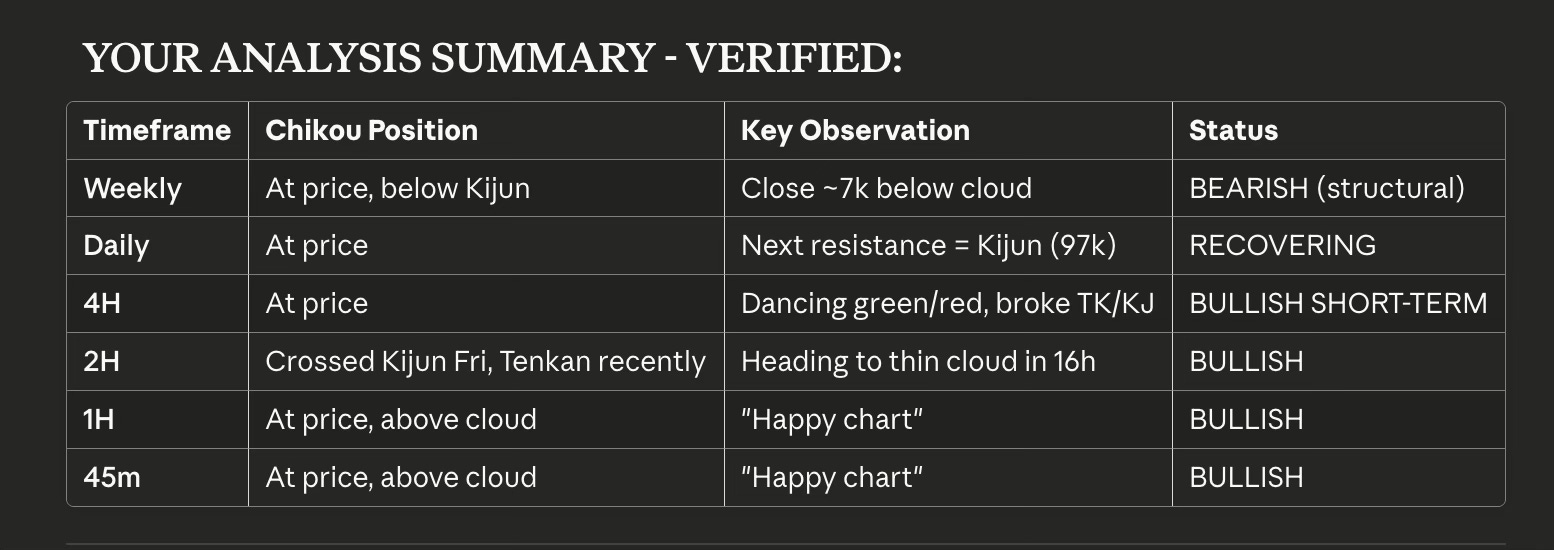 The higher timeframes—daily, weekly—remain structurally bearish. Price is far below cloud support. The daily needs to reclaim 97k (Kijun) to show meaningful recovery. The weekly needs to reclaim 100k to invalidate the breakdown.