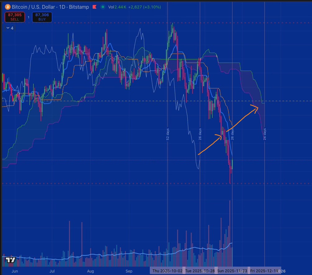 If price holds above 80k and consolidates in the 85-90k range, the Lagging Span takes 36 weeks to reach the cloud—not until August 2026. That’s 29 extra weeks for the market to prove this is a correction, not a bear market.