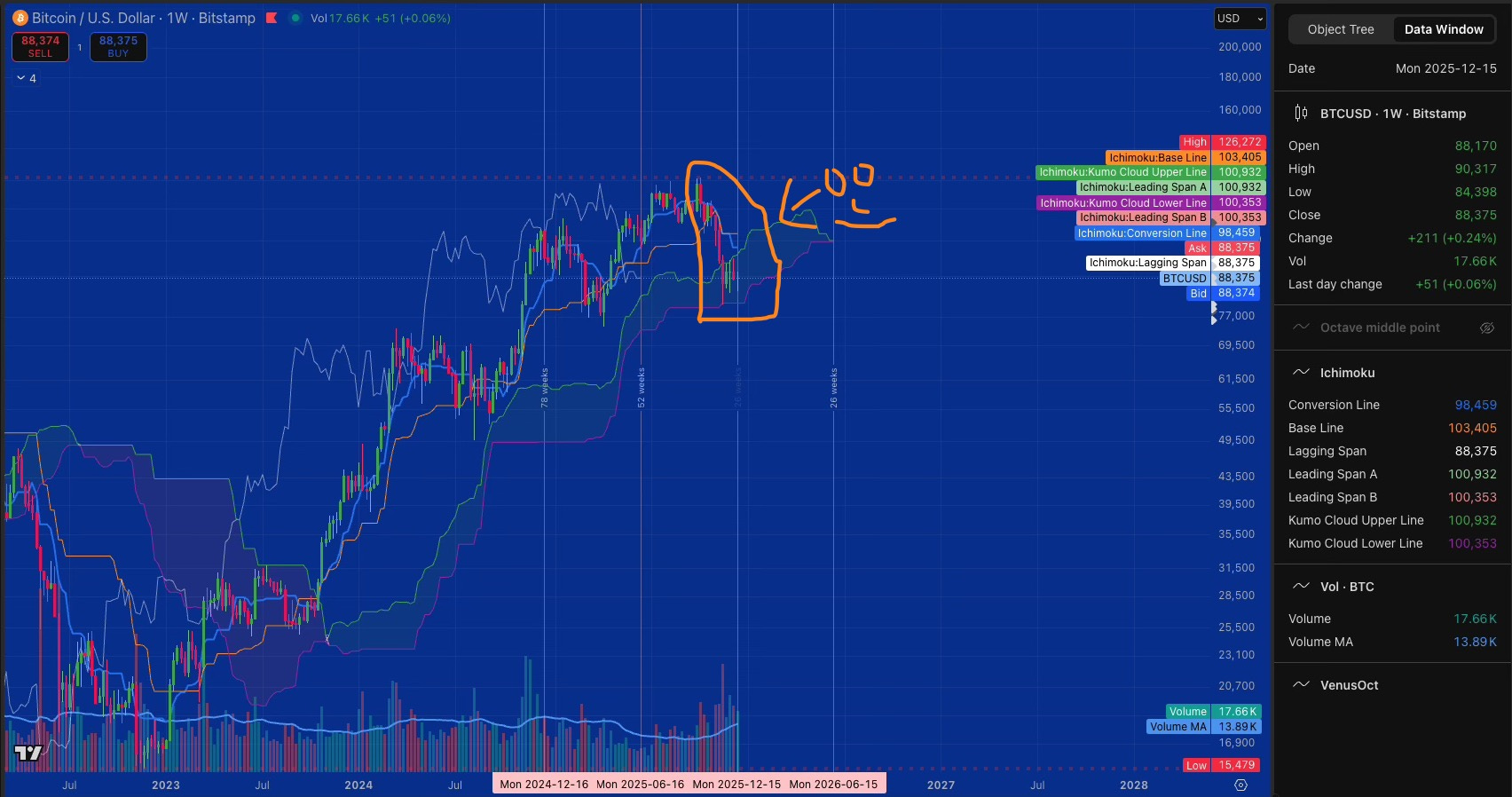 Most likely: Continued consolidation between 86-92k until volume commits, the Chikou cross is necessary but not sufficient; the market hasn’t chosen the direction yet although it has slightly pivoted.