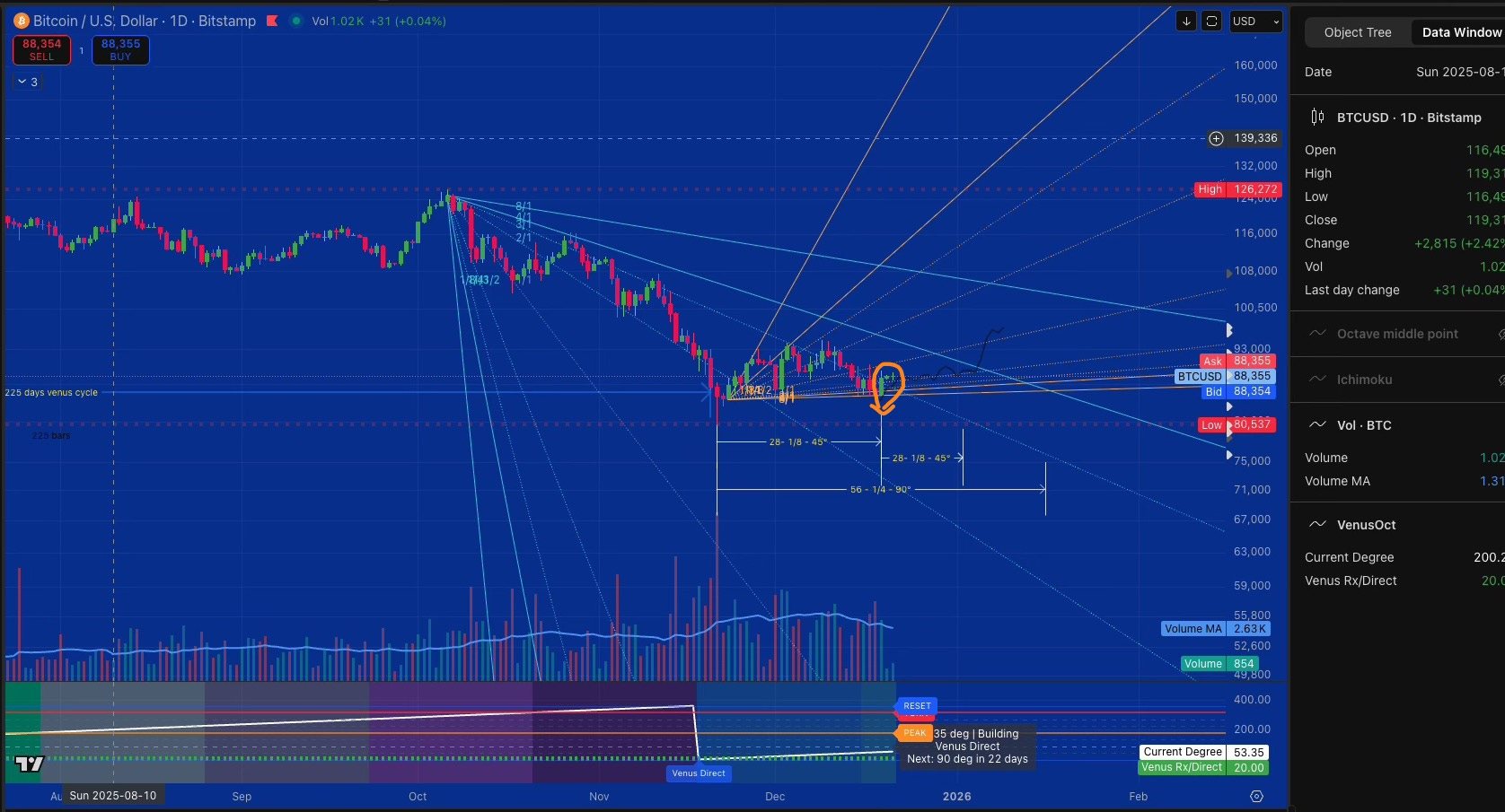 The Gann fans - one descending from the 10/6 high, one ascending from the 11/17 low - crossed on December 19, at 87,2k marking the geometric center of the consolidation triangle. Price sits at this intersection, waiting for direction. The timing framework identified the window. The market confirmed it - shyly.