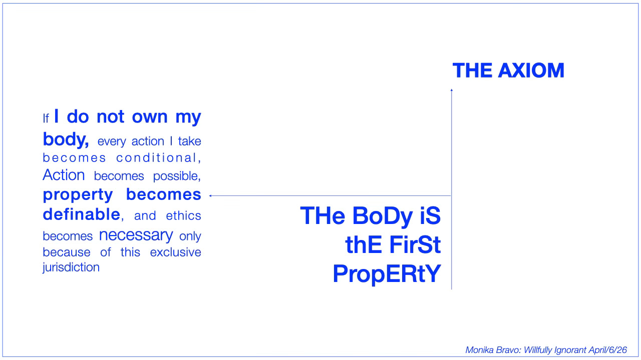 The body is the first boundary »»»> If I don’t own my body, every action I take becomes conditional. I move when I am allowed, I act when it is permitted, I access when it is granted. Ownership becomes access, access becomes permission; permission becomes dependence. And dependence sets the terms of your movement.