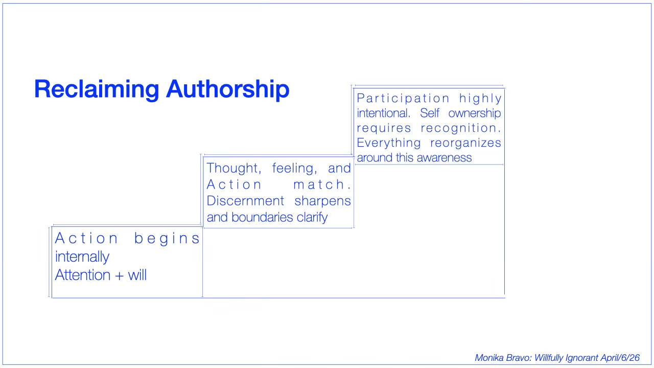 There is a moment where something does not align, you feel it before you understand it. A question appears: “Why do I need permission for this?” That question interrupts the automatic consenting. Attention returns, you may start reading the small print again, while you start questioning it. As you notice where and why you are agreeing thus participation becomes intentional. Your freedom lives in awareness, ignoring it reorganizes the structure of your life around something external, an outer authority.