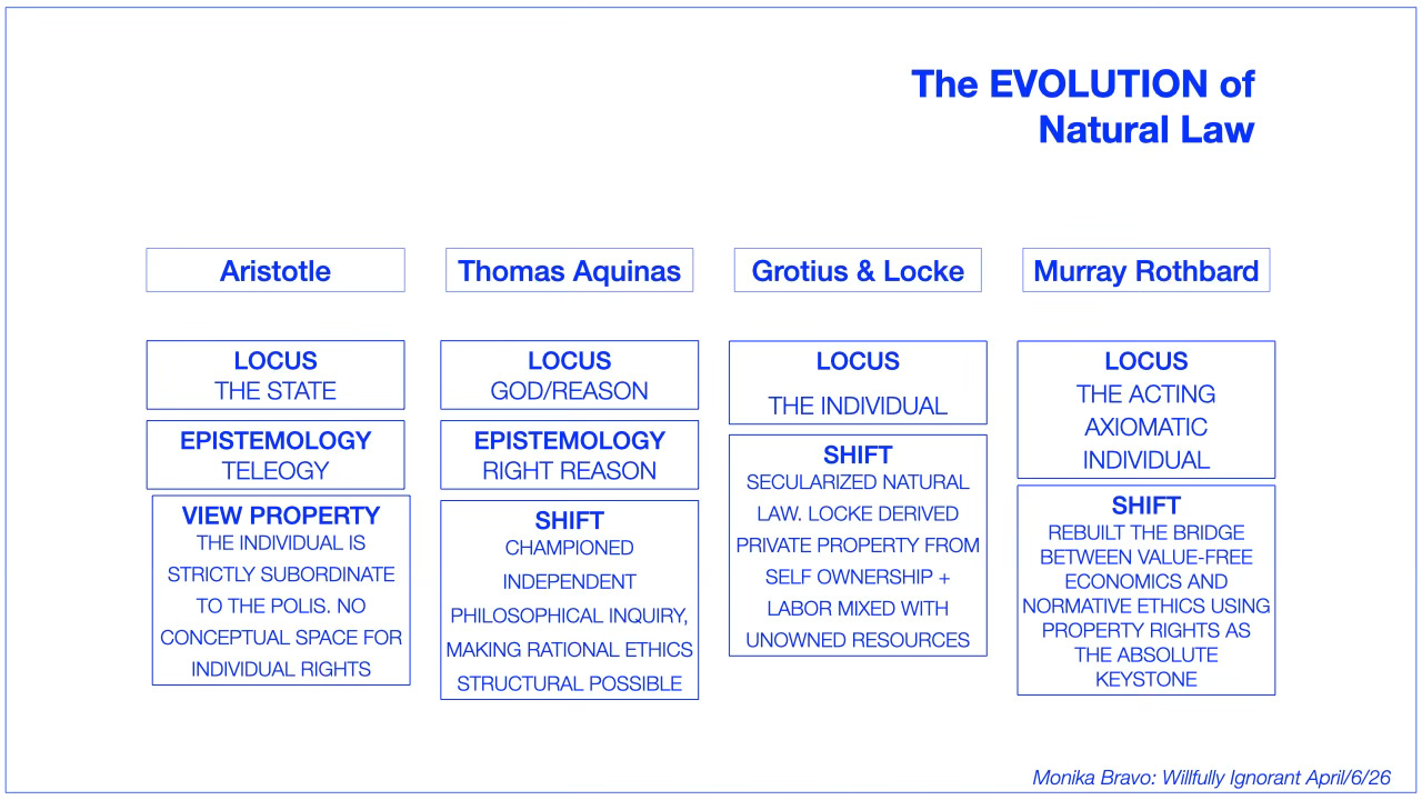 Murray Rothbard sharpens this into a rigorous framework: self-ownership becomes the axiom. From there, Natural Law defines what is permissible: no aggression, no coercion, no violation of another’s property. Ethics becomes a solid structure, defining the difference between what is lawful in principle and what is declared legal in practice.